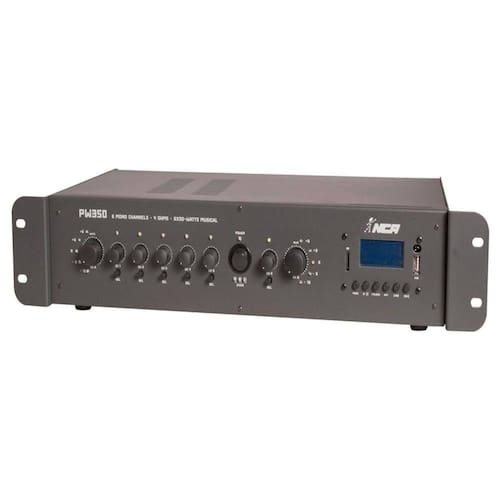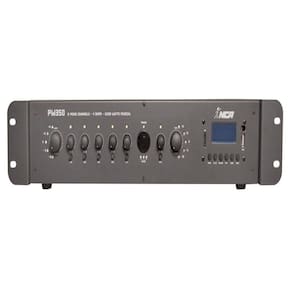 Conjunto 6 amplificadores nca - pw 350 conjunto de 06 amplificadores mono de 30w rms cada. dual zone com volume master independente (in a e in b), vu ou até 06 entradas mono com volumes individuais. chaves de seleção individuais com indicação luminosa e saídas independentes. permite a utilização com o setorizador de canais st100. especificações técnicas módulo média player: tela lcd de 2 polegadas, rádio fm com 18 posições . entrada usb (pendrive) e micro sd card, change folder e controle remoto. potência total:180wrms 4 ohms potência por canal:30wrms 4 ohms entradas: 02 auxiliares rca (l e r) master 06 auxiliares rca mono (01 por canal) 01 usb 01 sd card saídas: 1 parallel output l e r por canal volumes: cha e chb com volumes independentes ch1 a ch6 com volumes independentes alimentação:127/220v dimensões (mm): (l) 485 x (h) 90 x (p) 350 peso (kg): 4,72