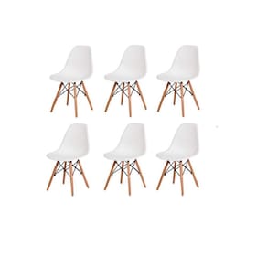 Conjunto 6 Cadeiras Charles Eames Wood Base Madeira Branca Cadeira Eiffel Eames Base Madeira A CADEIRA CHARLES EAMES EIFFEL foi criada nos anos 50, é vencedora do Museu de Nova York da concorrência Design de Mobiliário Low-Cost Arte Moderna Internacional. Sua base é em MADEIRA no formato de uma torre faz com que o ambiente não fique sobrecarregado. Adequa-se perfeitamente para compor conjunto de mesa de jantar ou qualquer outro ambiente em sua casa ou escritório. Ideal para receber amigos e familiares com um toque de elegância e charme. As pernas da cadeira são em madeira e fios de aço preto no qual garantem estabilidade à cadeira.
