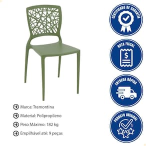 - Se você busca um item para completar seus ambientes e garantir muito mais beleza e conforto, escolha a cadeira Tramontina Joana em polipropileno e fibra de vidro verde oliva.