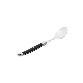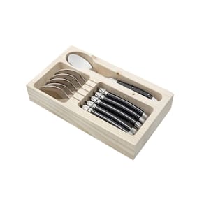 Toda a tradição das facas Laguiole é encontrada nesta linha de colheres. Feitas em aço inoxidável de altíssima qualidade com cabo em ABS preto. O conjunto de colheres é entregue em uma elegante bandeja de madeira.