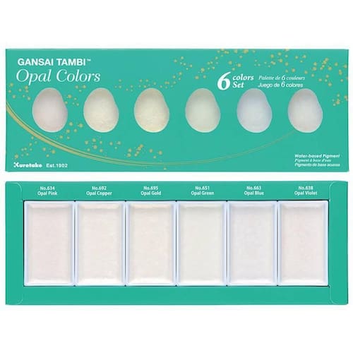 Conjunto de tintas aquosas pérolas polarizadas 6 cores. As cores Gansai que refletem vários tons de cor dependem do ângulo de sua visão, bem como da absorção de luz. Ele brilha em tons pálidos e perolados em papel branco, e um brilho forte e metálico em papel de cor escura. Quanto mais forte e mais direta a luz atinge as cores, mais elas brilham e brilham. Cores misturadas: As cores de opala podem ser misturadas umas com as outras ou com outros tipos de tintas à base de água. Adicione detalhes brilhantes às suas criações usando as cores de opala Gansai Tambi. Versatilidade: Ideal para caligrafia e escrita de pincel, ilustrações, arte fina e muito mais. Crie obras de arte exclusivas adicionando detalhes diferentes de qualquer outro. as panelas Gansai são muito maiores do que as panelas de aquarela típicas, dando a você a capacidade de usar pincéis pequenos ou maiores com bastante facilidade. Certificação: Sem xileno, em conformidade com a norma ASTM D 4236, com certificação ACMI para segurança, marca AP registrada para venda nos Estados Unidos. Produto Feito no Japão - O controle de qualidade para gerenciar a riqueza e a sutileza de cores é cuidadosamente considerado quando produzido no Japão. Ean: 4901427315004