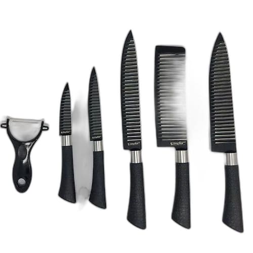 - dimensões da peça: - descascador: 14,5 x 6,2 x 2cm - faca legumes: 20,5 x 3 x 1,6cm - faca de cozinha: 24 x 3 x 1,6cm - faca de cozinha: 33,5 x 3,6 x 2,1cm - faca de pão: 33,5 x 3,6 x 2cm - faca de carne: 33,5 x 4,4 x 2,1cm - dimensões da embalagem: 36 x 21,5 x 3cm