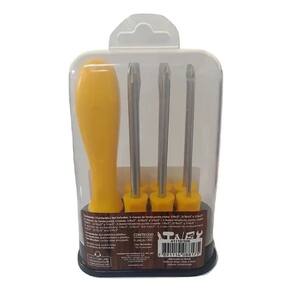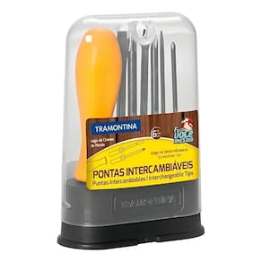 Descrição Jogo de Chaves Fenda/Philips Tramontina 6 Peças Intercambiáveis - 41110506Este Jogo de Chaves Fenda/Philips Tramontina de 6 Peças Intercambiáveis é a solução completa para suas necessidades de aperto e desaperto. Com chaves fenda e philips intercambiáveis, este conjunto oferece versatilidade para lidar com uma variedade de parafusos. A qualidade Tramontina garante durabilidade e desempenho confiável, tornando este conjunto indispensável para projetos domésticos ou profissionais. Tenha todas as ferramentas necessárias à mão com o Jogo de Chaves Fenda/Philips Tramontina, facilitando suas tarefas de manutenção e reparo.Especificações Técnicas:• As hastes das chaves de fenda com resistência mecânica e dureza.• Cabos injetados com material de alta resistência.• Os dimensionais das pontas são verificados com gabaritos-padrão, calibrados e certificados.• As ferramentas são produzidas e testadas conforme normas específicas.• 3 Ponteiras Ponta Chata - 1/8x3", 3/16x3" e 1/4x3"• 3 Ponteiras Ponta Cruzada - 1/8x3", 3/16x3" e 1/4x3"• 1 Suporte para ponteiraConteúdo da Embalagem:• 01 Jogo de Chaves Fenda/Philips Tramontina 6 Peças Intercambiáveis