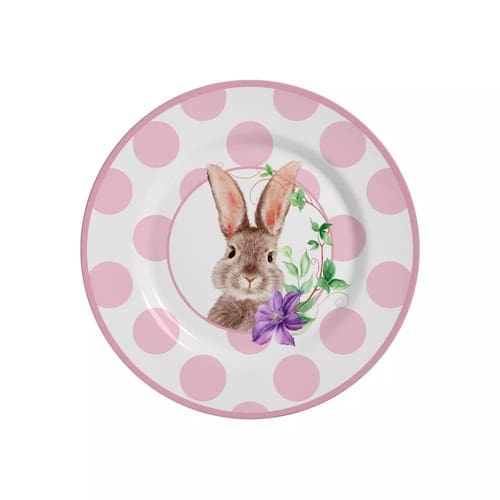 Conjunto 6 Pratos Sobremesa Coelha Amy Pascoa Alleanza Decore com a Boleira com Pé de Poá Dourado e dê um toque especial à sua mesa de doces nesta Páscoa. Com o diâmetro de 34 cm, essa boleira é perfeita para servir e apresentar bolos, tortas e outros doces. A boleira possui bolinhas douradas que dão um toque de sofisticação e diversão ao seu visual. Feito de materiais de alta qualidade é resistente, durável e fácil de limpar.