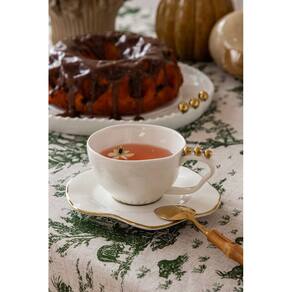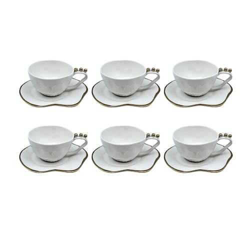 Conjunto 6 Xícaras de Chá com Pires em Cerâmica Branco e Dourado