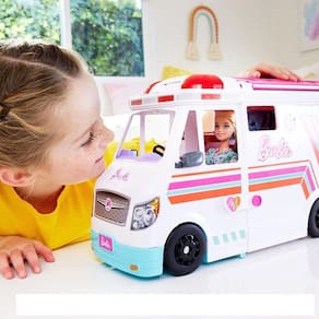 Com a diversão 2 em 1, o carro e conjunto Barbie Care Clinic permitem que as crianças cuidem dos pacientes em qualquer lugar. As crianças podem empurrar a ambulância para o resgate, com luzes e sons ativados com o toque de um botão.