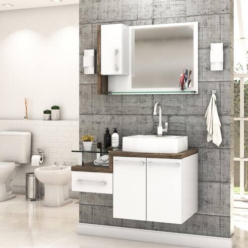 Sobre o ProdutoConjunto Balcão C/Cuba Aria 41 e Espelheira Legno 830 Branco ChessDescrição do Produto:O Conjunto (Balcão + Cuba + Espelheira) Legno KTLG830 é um produto compacto, de design contemporâneo e minimalista, projetado para se encaixar no seu espaço, composto por um gabinete com gaveta lateral e tampo de apoio de vidro 10mm. A espelheira possui 01 porta, espelho lapidado e 01 prateleira de vidro 10mm, sendo perfeita para organizar suas coisas e fazer parte da decoração do seu linha Legno combina a leveza do branco e detalhes em vidro com tons amadeirados, conferindo uma personalidade contemporânea aos móveis de design minimalista e traços retos. Produtos que aliam funcionalidade e praticidade ao seu dia a dia são características marcantes desta coleção!Itens Inclusos:1 Conjunto Balcão C/Cuba e EspelheiraDimensões dos Produtos:Gabinete: 83 x 43 x 51 cmEspelheira: 77 x 15 x 54 cmCuba 41 x 30 x 9,5 cmInformações Logísticas (Comp. X Prof. X Alt.) 60 x 50,5 x 58 cm - Peso: 26,91 81 x 19 x 59 cm - Peso: 10,685 KgPeso Total: 37,595 KgObservações:Não acompanha acessórios decorativos. Imagens meramente ilustrativas.Informações Técnicas / Características:- Cor do Produto: Branco Chess- Cor do Predominante: Branco- Marca: Compace- Modelo: KTLG830- Linha: Legno- Material: Mdp - Acabamento: Perffect Acetinado- Escala de Brilho: Fosco- Fita de Borda: Pvc- Possui Portas: 3- Tipo de Porta: Bater- Tipo da Dobradiça: Metálica- Possui Gavetas: 1- Tipo da Corrediça: Telescópica- Possui Chave: Não- Peso Máximo por Gaveta: 3 kg- Material do Puxador: Abs- Possui Prateleiras: 2- Peso Máximo por Prateleira: 1 kg Espelheira / 4 kg Balcão- Possui Pés: Não, suspenso - Possui Espelho: Sim- Possui Vidro: Sim- Acompanha Cuba / Lavatório: Sim, de Mármore Sintético- Furação para Cuba / Lavatório: Não- Tipo da Cuba: Apoio- Cor da Cuba: Branca- Suporta Até (kg): 20 kg - Peso Lí.: 34,56Kg- Recomendações de Uso, Manutenção e Limpeza: Para a limpeza, utilize flanela seca ou pano macio levemente umedecido em água. Utilize um pano seco em seguida. Evite com produtos químicos (solventes, thinner, acetona, etc) e não utilize nenhum tipo de esponja de aço.- Necessita de Montagem: Sim / Acompanha Manual de Montagem- Complexidade da Montagem: Média: pode ser montado por mais de uma pessoa e/ou necessite de maior conhecimento para montagem.- Garantia: 6 meses Material: Mdp | Acabamento: Perffect Acetinado | Escala de Brilho: Fosco | Fita de Borda: Pvc | Possui Portas: 3 | Tipo de Porta: Bater | Tipo da Dobradiça: Metálica | Limite de unidades por venda: É possível comprar até 1 unidade por venda. | Comprimento: 83 | Quantidade máxima de pedido: 1 | Largura: 43 | Altura: 51 | Profundidade: 43 | Preço tabelado: 635 | Cor: Multicolorido | Certificação de teste externa: Não Aplicável | Baterias são necessárias?: false | Palavras-chave de Pesquisa: Não aplicável | Fonte de energia: Não aplicável | Fabricante: Compace | da peça: | Principais Características do Produto 0: | Exige montagem: | Peso do item: | Componentes incluídos: | Dimensões do item P x L x A: | Is Fragile: | Principais Características do Produto 2: | Principais Características do Produto 1: | Quantidade de itens: | de caixas: | do modelo: Cor: Branco Chess C/Carvalho Dark