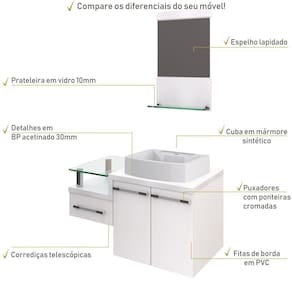 Conjunto Balcão C/cuba Aria 41 E Espelheira Legno 831 Perffect Acetinado Branco Chess C/branco Chess Sobre o ProdutoConjunto Balcão C/Cuba Aria 41 e Espelheira Legno 831 Branco ChessDescrição do Produto:O Conjunto (Balcão + Cuba + Espelheira) Legno KTLG831 é um produto compacto, de design contemporâneo e minimalista, projetado para se encaixar no seu espaço, composto por um gabinete com gaveta lateral e tampo de apoio de vidro 10mm. A espelheira possui espelho lapidado e 01 prateleira de vidro 10mm, sendo perfeita para organizar suas coisas e fazer parte da decoração do seu linha Legno combina a leveza do branco e detalhes em vidro com tons amadeirados, conferindo uma personalidade contemporânea aos móveis de design minimalista e traços retos. Produtos que aliam funcionalidade e praticidade ao seu dia a dia são características marcantes desta coleção!Itens Inclusos:1 Conjunto Balcão C/Cuba e EspelheiraDimensões dos Produtos:Gabinete: 83 x 43 x 51 cmEspelheira: 37,5 x 11,5 x 67,5 cmCuba 41 x 30 x 9,5 cmInformações Logísticas (Comp. X Prof. X Alt.) 60 x 50,5 x 58 cm - Peso: 31,19 KgPeso Total: 31,19 KgObservações:Não acompanha acessórios decorativos. Imagens meramente ilustrativas.Informações Técnicas / Características:- Cor do Produto: Branco Chess- Cor do Predominante: Branco- Marca: Compace- Modelo: KTLG831- Linha: Legno- Material: Mdp - Acabamento: Perffect Acetinado- Escala de Brilho: Fosco- Fita de Borda: Pvc- Possui Portas: 2- Tipo de Porta: Bater- Tipo da Dobradiça: Metálica- Possui Gavetas: 1- Tipo da Corrediça: Telescópica- Possui Chave: Não- Peso Máximo por Gaveta: 3 kg- Material do Puxador: Abs- Possui Prateleiras: 2- Peso Máximo por Prateleira: 1 kg Espelheira / 4 kg Balcão- Possui Pés: Não, suspenso - Possui Espelho: Sim- Possui Vidro: Sim- Acompanha Cuba / Lavatório: Sim, de Mármore Sintético- Furação para Cuba / Lavatório: Não- Tipo da Cuba: Apoio- Cor da Cuba: Branca- Suporta Até (kg): 20 kg - Peso Lí.: 29,23Kg- Recomendações de Uso, Manutenção e Limpeza: Para a limpeza, utilize flanela seca ou pano macio levemente umedecido em água. Utilize um pano seco em seguida. Evite com produtos químicos (solventes, thinner, acetona, etc) e não utilize nenhum tipo de esponja de aço.- Necessita de Montagem: Sim / Acompanha Manual de Montagem- Complexidade da Montagem: Média: pode ser montado por mais de uma pessoa e/ou necessite de maior conhecimento para montagem.- Garantia: 6 meses Material: Mdp | Acabamento: Perffect Acetinado | Escala de Brilho: Fosco | Fita de Borda: Pvc | Possui Portas: 2 | Tipo de Porta: Bater | Tipo da Dobradiça: Metálica | Comprimento: 83 | Limite de unidades por venda: É possível comprar até 1 unidade por venda. | Largura: 43 | Quantidade máxima de pedido: 1 | Altura: 51 | Profundidade: 43 | Preço tabelado: | Cor: Multicolorido | Certificação de teste externa: Não Aplicável | Baterias são necessárias?: false | Palavras-chave de Pesquisa: Não aplicável | Fonte de energia: Não aplicável | Fabricante: Compace | Dimensões do item P x L x A: | Principais Características do Produto 0: | da peça: | Principais Características do Produto 2: | Peso do item: | Componentes incluídos: | Exige montagem: | Principais Características do Produto 1: | Is Fragile: | Quantidade de itens: | do modelo: | de caixas: Cor: Branco Chess C/Branco Chess