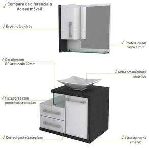 Sobre o ProdutoConjunto Balcão C/Cuba L38 e Espelheira Legno 650 Branco ChessDescrição do Produto:O Conjunto (Balcão + Cuba + Espelheira) Legno KTLG650 é um produto compacto, de design contemporâneo e minimalista, projetado para se encaixar no seu espaço, composto por um gabinete com cuba de apoio, 02 gavetas laterais e detalhe em vidro 10mm. A espelheira possui 01 porta, espelho lapidado e 01 prateleira de vidro 10mm, sendo perfeita para organizar suas coisas e fazer parte da decoração do seu linha Legno combina a leveza do branco e detalhes em vidro com tons amadeirados, conferindo uma personalidade contemporânea aos móveis de design minimalista e traços retos. Produtos que aliam funcionalidade e praticidade ao seu dia a dia são características marcantes desta coleção!Itens Inclusos:1 Conjunto Balcão C/Cuba e EspelheiraDimensões dos Produtos:Gabinete: 65 x 45 x 50 cmEspelheira: 59 x 15 x 54 cmCuba 38,5 x 33 x 11,5 cmInformações Logísticas (Comp. X Prof. X Alt.) 70 x 50 x 56 cm - Peso: 25,75 63 x 19 x 59 cm - Peso: 9,065 KgPeso Total: 34,815 KgObservações:Não acompanha acessórios decorativos. Imagens meramente ilustrativas.Informações Técnicas / Características:- Cor do Produto: Branco Chess- Cor do Predominante: Branco- Marca: Compace- Modelo: KTLG650- Linha: Legno- Material: Mdp - Acabamento: Perffect Acetinado- Escala de Brilho: Fosco- Fita de Borda: Pvc- Possui Portas: 2- Tipo de Porta: Bater- Tipo da Dobradiça: Metálica- Possui Gavetas: 2- Tipo da Corrediça: Telescópica- Possui Chave: Não- Peso Máximo por Gaveta: 3 kg- Material do Puxador: Abs- Possui Prateleiras: 1- Peso Máximo por Prateleira: 1 kg- Possui Pés: Não, suspenso - Possui Espelho: Sim- Possui Vidro: Sim- Acompanha Cuba / Lavatório: Sim, de Mármore Sintético- Furação para Cuba / Lavatório: Não- Tipo da Cuba: Apoio- Cor da Cuba: Branca- Suporta Até (kg): 20 kg - Peso Lí.: 31,82Kg- Recomendações de Uso, Manutenção e Limpeza: Para a limpeza, utilize flanela seca ou pano macio levemente umedecido em água. Utilize um pano seco em seguida. Evite com produtos químicos (solventes, thinner, acetona, etc) e não utilize nenhum tipo de esponja de aço.- Necessita de Montagem: Sim / Acompanha Manual de Montagem- Complexidade da Montagem: Média: pode ser montado por mais de uma pessoa e/ou necessite de maior conhecimento para montagem.- Garantia: 6 meses Material: Mdp | Acabamento: Perffect Acetinado | Escala de Brilho: Fosco | Fita de Borda: Pvc | Possui Portas: 2 | Tipo de Porta: Bater | Tipo da Dobradiça: Metálica | Limite de unidades por venda: É possível comprar até 1 unidade por venda. | Comprimento: 65 | Quantidade máxima de pedido: 1 | Largura: 42 | Altura: 19 | Profundidade: 42 | Preço tabelado: 620 | Cor: Multicolorido | Certificação de teste externa: Não Aplicável | Baterias são necessárias?: false | Palavras-chave de Pesquisa: Não aplicável | Fonte de energia: Não aplicável | Fabricante: Compace | Exige montagem: | Componentes incluídos: | da peça: | Peso do item: | Dimensões do item P x L x A: | Is Fragile: | Principais Características do Produto 2: | Principais Características do Produto 1: | Principais Características do Produto 0: | Quantidade de itens: | do modelo: | de caixas: Cor: Branco Chess C/Preto Ônix