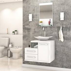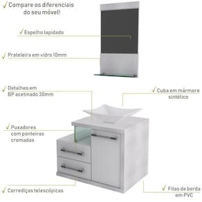 Conjunto Balcão C/cuba L38 E Espelheira Legno 651 Perffect Acetinado Branco Chess C/branco Chess Sobre o ProdutoConjunto Balcão C/Cuba L38 e Espelheira Legno 651 Branco ChessDescrição do Produto:O Conjunto (Balcão + Cuba + Espelheira) Legno KTLG651 é um produto compacto, de design contemporâneo e minimalista, projetado para se encaixar no seu espaço, composto por um gabinete com cuba de apoio, 02 gavetas laterais e detalhe em vidro 10mm. A espelheira possui espelho lapidado e 01 prateleira de vidro 10mm, sendo perfeita para organizar suas coisas e fazer parte da decoração do seu linha Legno combina a leveza do branco e detalhes em vidro com tons amadeirados, conferindo uma personalidade contemporânea aos móveis de design minimalista e traços retos. Produtos que aliam funcionalidade e praticidade ao seu dia a dia são características marcantes desta coleção!Itens Inclusos:1 Conjunto Balcão C/Cuba e EspelheiraDimensões dos Produtos:Gabinete: 65 x 45 x 50 cmEspelheira: 37,5 x 11,5 x 67,5 cmCuba 38,5 x 33 x 11,5 cmInformações Logísticas (Comp. X Prof. X Alt.) 70 x 50 x 56 cm - Peso: 30,03 KgPeso Total: 30,03 KgObservações:Não acompanha acessórios decorativos. Imagens meramente ilustrativas.Informações Técnicas / Características:- Cor do Produto: Branco Chess- Cor do Predominante: Branco- Marca: Compace- Modelo: KTLG651- Linha: Legno- Material: Mdp - Acabamento: Perffect Acetinado- Escala de Brilho: Fosco- Fita de Borda: Pvc- Possui Portas: 1- Tipo de Porta: Bater- Tipo da Dobradiça: Metálica- Possui Gavetas: 2- Tipo da Corrediça: Telescópica- Possui Chave: Não- Peso Máximo por Gaveta: 3 kg- Material do Puxador: Abs- Possui Prateleiras: 1 - Possui Pés: Não, suspenso - Possui Espelho: Sim- Possui Vidro: Sim- Acompanha Cuba / Lavatório: Sim, de Mármore Sintético- Furação para Cuba / Lavatório: Não- Tipo da Cuba: Apoio- Cor da Cuba: Branca- Suporta Até (kg): 20 kg - Peso Lí.: 27,95Kg- Recomendações de Uso, Manutenção e Limpeza: Para a limpeza, utilize flanela seca ou pano macio levemente umedecido em água. Utilize um pano seco em seguida. Evite com produtos químicos (solventes, thinner, acetona, etc) e não utilize nenhum tipo de esponja de aço.- Necessita de Montagem: Sim / Acompanha Manual de Montagem- Complexidade da Montagem: Média: pode ser montado por mais de uma pessoa e/ou necessite de maior conhecimento para montagem.- Garantia: 6 meses Material: Mdp | Acabamento: Perffect Acetinado | Escala de Brilho: Fosco | Fita de Borda: Pvc | Possui Portas: 1 | Tipo de Porta: Bater | Tipo da Dobradiça: Metálica | Limite de unidades por venda: É possível comprar até 1 unidade por venda. | Tipo de Produto: Gabinete de banheiro | Fabricante: Compace | Quantidade máxima de pedido: 1 | Comprimento: 65 | Largura: 45 | Altura: 53 | Profundidade: 45 | Preço tabelado: 549 | Cor: Multicolorido | Certificação de teste externa: Não Aplicável | Baterias são necessárias?: false | Palavras-chave de Pesquisa: Não aplicável | Fonte de energia: Não aplicável | Peso do item: | Componentes incluídos: | Principais Características do Produto 2: | Exige montagem: | da peça: | Principais Características do Produto 1: | Dimensões do item P x L x A: | Is Fragile: | Principais Características do Produto 0: | Quantidade de itens: | do modelo: | de caixas: Cor: Branco Chess C/Branco Chess