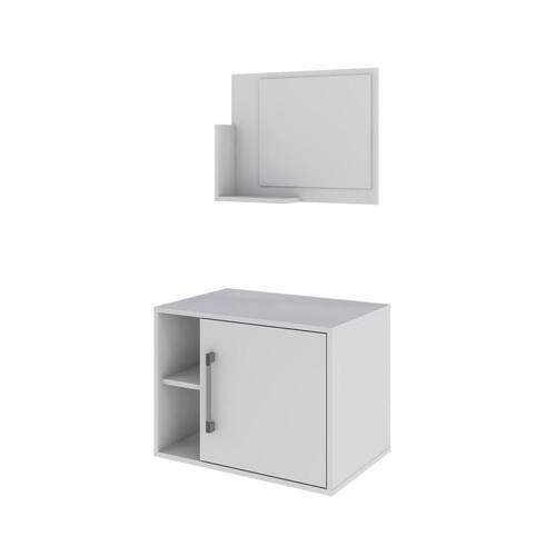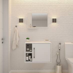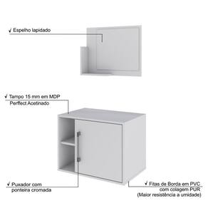 O Conjunto Balcão e Espelheira Soft 600 GESF600 tem design compacto, perfeito para pequenos espaços, conta com uma prateleira lateral e uma cuba de apoio, além da espelheira.