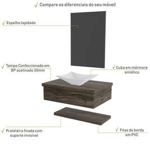 Sobre o ProdutoConjunto Bancada C/Cuba L30, Prateleira e Espelheira Metrópole 606 Branco ChessDescrição do Produto:O Conjunto (Bancada + Cuba + Espelheira + Prateleira) Metrópole KTME606 é um produto compacto de design simples e moderno, projetado para pequenos espaços, perfeito para fazer parte da decoração do seu lavabo ou banheiro. Conta com uma cuba de apoio, uma espelheira e prateleira com pinos invisíveis, além do suporte linha Metrópole é uma coleção de móveis modernos e com inúmeras possibilidades de composições, combinando design contemporâneo e muita funcionalidade. Diversas possibilidades de cores e modelos de cubas formam uma solução perfeita para as mais opções de decoração e projetos em ambientes de banheiro. É você quem decide!!!Itens Inclusos:1 Conjunto Bancada C/Cuba, Prateleira e EspelheiraDimensões dos Produtos:Bancada: 60 x 43 x 19 cmEspelheira: 43 x 1,8 x 60 cmCuba 29,8 x 29,8 x 11,5 cmInformações Logísticas (Comp. X Prof. X Alt.) 63 x 47 x 26 cm - Peso: 17,68 KgPeso Total: 17,68 KgObservações:Não acompanha acessórios decorativos. Imagens meramente ilustrativas.Informações Técnicas / Características:- Cor do Produto: Branco Chess- Cor do Predominante: Branco- Marca: Compace- Modelo: KTME606- Linha: Metrópole- Material: Mdp - Acabamento: Perffect Acetinado- Escala de Brilho: Fosco- Fita de Borda: Pvc - Possui Gavetas: Não - Material do Puxador: Alumínio- Possui Prateleiras: 1- Peso Máximo por Prateleira: 02 kg- Possui Pés: Não, suspenso - Possui Espelho: Sim - Acompanha Cuba / Lavatório: Sim, de Mármore Sintético- Furação para Cuba / Lavatório: Não- Tipo da Cuba: Apoio- Cor da Cuba: Branca- Suporta Até (kg): 12 kg - Peso Lí.: 16,78Kg- Recomendações de Uso, Manutenção e Limpeza: Para a limpeza, utilize flanela seca ou pano macio levemente umedecido em água. Utilize um pano seco em seguida. Evite com produtos químicos (solventes, thinner, acetona, etc) e não utilize nenhum tipo de esponja de aço.- Necessita de Montagem: Sim / Acompanha Manual de Montagem- Complexidade da Montagem: Média: pode ser montado por mais de uma pessoa e/ou necessite de maior conhecimento para montagem.- Garantia: 6 meses- Outras Características: Montagem ível, o suporte toalheiro pode ser montado em qualquer um dos lados. Material: Mdp | Acabamento: Perffect Acetinado | Escala de Brilho: Fosco | Fita de Borda: Pvc | Comprimento: 60 | Largura: 42 | Altura: 19 | Profundidade: 42 | Limite de unidades por venda: É possível comprar até 1 unidade por venda. | Quantidade máxima de pedido: 1 | Preço tabelado: 339 | Cor: Multicolorido | Certificação de teste externa: Não Aplicável | Baterias são necessárias?: false | Palavras-chave de Pesquisa: Não aplicável | Fonte de energia: Não aplicável | Fabricante: Compace | Is Fragile: | Peso do item: | Exige montagem: | Principais Características do Produto 2: | da peça: | Componentes incluídos: | Dimensões do item P x L x A: | Principais Características do Produto 1: | Principais Características do Produto 0: | do modelo: | de caixas: | Quantidade de itens: Cor: Carvalho Dark