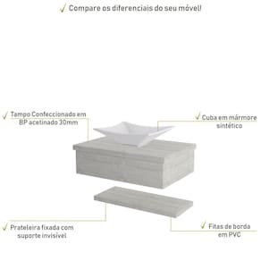 Sobre o ProdutoConjunto Bancada C/Cuba L38 e Prateleira Metrópole 605 Branco ChessDescrição do Produto:O Conjunto (Bancada + Cuba + Prateleira) Metrópole KTME605 é um produto compacto de design simples e moderno, projetado para pequenos espaços, perfeito para fazer parte da decoração do seu lavabo ou banheiro. Conta com uma cuba de apoio e uma prateleira com pinos invisíveis, além do suporte linha Metrópole é uma coleção de móveis modernos e com inúmeras possibilidades de composições, combinando design contemporâneo e muita funcionalidade. Diversas possibilidades de cores e modelos de cubas formam uma solução perfeita para as mais opções de decoração e projetos em ambientes de banheiro. É você quem decide!!!Itens Inclusos:1 Conjunto Bancada C/Cuba e PrateleiraDimensões dos Produtos:Bancada: 60 x 43 x 19 cmCuba 38,5 x 33 x 11,5 cmInformações Logísticas (Comp. X Prof. X Alt.) 63 x 47 x 26 cm - Peso: 14,49 KgPeso Total: 14,49 KgObservações:Não acompanha acessórios decorativos. Imagens meramente ilustrativas.Informações Técnicas / Características:- Cor do Produto: Branco Chess- Cor do Predominante: Branco- Marca: Compace- Modelo: KTME605- Linha: Metrópole- Material: Mdp - Acabamento: Perffect Acetinado- Escala de Brilho: Fosco- Fita de Borda: Pvc - Possui Gavetas: Não - Material do Puxador: Alumínio- Possui Prateleiras: 1- Peso Máximo por Prateleira: 02 kg- Possui Pés: Não, suspenso - Possui Espelho: Não - Acompanha Cuba / Lavatório: Sim, de Mármore Sintético- Furação para Cuba / Lavatório: Não- Tipo da Cuba: Apoio- Cor da Cuba: Branca- Suporta Até (kg): 12 kg - Peso Lí.: 13,59Kg- Recomendações de Uso, Manutenção e Limpeza: Para a limpeza, utilize flanela seca ou pano macio levemente umedecido em água. Utilize um pano seco em seguida. Evite com produtos químicos (solventes, thinner, acetona, etc) e não utilize nenhum tipo de esponja de aço.- Necessita de Montagem: Sim / Acompanha Manual de Montagem- Complexidade da Montagem: Média: pode ser montado por mais de uma pessoa e/ou necessite de maior conhecimento para montagem.- Garantia: 6 meses- Outras Características: Montagem ível, o suporte toalheiro pode ser montado em qualquer um dos lados. Material: Mdp | Acabamento: Perffect Acetinado | Escala de Brilho: Fosco | Fita de Borda: Pvc | Tipo de Produto: Bancada para Banheiro | Fabricante: Compace | Comprimento: 60 | Largura: 42 | Limite de unidades por venda: É possível comprar até 1 unidade por venda. | Quantidade máxima de pedido: 1 | Altura: 19 | Profundidade: 42 | Preço tabelado: | Cor: Multicolorido | Certificação de teste externa: Não Aplicável | Baterias são necessárias?: false | Palavras-chave de Pesquisa: Não aplicável | Fonte de energia: Não aplicável | Peso do item: | Principais Características do Produto 2: | Exige montagem: | Componentes incluídos: | Dimensões do item P x L x A: | Principais Características do Produto 1: | Principais Características do Produto 0: | Is Fragile: | da peça: | Quantidade de itens: | de caixas: | do modelo: Cor: Snow