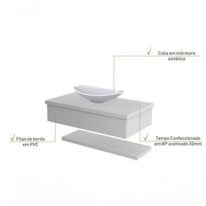 Conjunto Bancada C/cuba L45 E Prateleira Metrópole 805 Perffect Acetinado Branco Chess Sobre o ProdutoConjunto Bancada C/Cuba L45 e Prateleira Metrópole 805 Branco ChessDescrição do Produto:O Conjunto (Bancada + Cuba + Prateleira) Metrópole KTME805 é um produto compacto de design simples e moderno, projetado para pequenos espaços, perfeito para fazer parte da decoração do seu lavabo ou banheiro. Conta com uma cuba de apoio e uma prateleira com pinos invisíveis, além do suporte linha Metrópole é uma coleção de móveis modernos e com inúmeras possibilidades de composições, combinando design contemporâneo e muita funcionalidade. Diversas possibilidades de cores e modelos de cubas formam uma solução perfeita para as mais opções de decoração e projetos em ambientes de banheiro. É você quem decide!!!Itens Inclusos:1 Conjunto Bancada C/Cuba e PrateleiraDimensões dos Produtos:Bancada: 80 x 43 x 19 cmCuba 45 x 30,7 x 11,5 cmInformações Logísticas (Comp. X Prof. X Alt.) 83 x 47 x 26 cm - Peso: 18,09 KgPeso Total: 18,09 KgObservações:Não acompanha acessórios decorativos. Imagens meramente ilustrativas.Informações Técnicas / Características:- Cor do Produto: Branco Chess- Cor do Predominante: Branco- Marca: Compace- Modelo: KTME805- Linha: Metrópole- Material: Mdp - Acabamento: Perffect Acetinado- Escala de Brilho: Fosco- Fita de Borda: Pvc - Possui Gavetas: Não - Material do Puxador: Alumínio- Possui Prateleiras: 1- Peso Máximo por Prateleira: 02 kg- Possui Pés: Não, suspenso - Possui Espelho: Não - Acompanha Cuba / Lavatório: Sim, de Mármore Sintético- Furação para Cuba / Lavatório: Não- Tipo da Cuba: Apoio- Cor da Cuba: Branca- Suporta Até (kg): 12 kg - Peso Lí.: 17,02Kg- Recomendações de Uso, Manutenção e Limpeza: Para a limpeza, utilize flanela seca ou pano macio levemente umedecido em água. Utilize um pano seco em seguida. Evite com produtos químicos (solventes, thinner, acetona, etc) e não utilize nenhum tipo de esponja de aço.- Necessita de Montagem: Sim / Acompanha Manual de Montagem- Complexidade da Montagem: Média: pode ser montado por mais de uma pessoa e/ou necessite de maior conhecimento para montagem.- Garantia: 6 meses- Outras Características: Montagem ível, o suporte toalheiro pode ser montado em qualquer um dos lados. Material: Mdp | Acabamento: Perffect Acetinado | Escala de Brilho: Fosco | Fita de Borda: Pvc | Tipo de Produto: Bancada para Banheiro | 80: Largura | Limite de unidades por venda: É possível comprar até 1 unidade por venda. | 19: Profundidade | Quantidade máxima de pedido: 1 | 42: Preço tabelado | Cor: Multicolorido | Certificação de teste externa: Não Aplicável | Baterias são necessárias?: false | Palavras-chave de Pesquisa: Não aplicável | Fonte de energia: Não aplicável | da peça: KTME805 | Fabricante: Compace | Principais Características do Produto 2: | Principais Características do Produto 1: | Exige montagem: | Is Fragile: | Peso do item: | Componentes incluídos: | Principais Características do Produto 0: | Dimensões do item P x L x A: | do modelo: | de caixas: | Quantidade de itens: Cor: Branco Chess