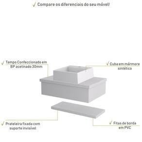Conjunto Bancada C/cuba Q355 E Prateleira Metrópole 605 Perffect Acetinado Branco Chess Sobre o ProdutoConjunto Bancada C/Cuba Q355 e Prateleira Metrópole 605 Branco ChessDescrição do Produto:O Conjunto (Bancada + Cuba + Prateleira) Metrópole KTME605 é um produto compacto de design simples e moderno, projetado para pequenos espaços, perfeito para fazer parte da decoração do seu lavabo ou banheiro. Conta com uma cuba de apoio e uma prateleira com pinos invisíveis, além do suporte linha Metrópole é uma coleção de móveis modernos e com inúmeras possibilidades de composições, combinando design contemporâneo e muita funcionalidade. Diversas possibilidades de cores e modelos de cubas formam uma solução perfeita para as mais opções de decoração e projetos em ambientes de banheiro. É você quem decide!!!Itens Inclusos:1 Conjunto Bancada C/Cuba e PrateleiraDimensões dos Produtos:Bancada: 60 x 43 x 19 cmCuba 35 x 35 x 11,5 cmInformações Logísticas (Comp. X Prof. X Alt.) 63 x 47 x 26 cm - Peso: 16,78 KgPeso Total: 16,78 KgObservações:Não acompanha acessórios decorativos. Imagens meramente ilustrativas.Informações Técnicas / Características:- Cor do Produto: Branco Chess- Cor do Predominante: Branco- Marca: Compace- Modelo: KTME605- Linha: Metrópole- Material: Mdp - Acabamento: Perffect Acetinado- Escala de Brilho: Fosco- Fita de Borda: Pvc - Possui Gavetas: Não - Material do Puxador: Alumínio- Possui Prateleiras: 1- Peso Máximo por Prateleira: 02 kg- Possui Pés: Não, suspenso - Possui Espelho: Não - Acompanha Cuba / Lavatório: Sim, de Mármore Sintético- Furação para Cuba / Lavatório: Não- Tipo da Cuba: Apoio- Cor da Cuba: Branca- Suporta Até (kg): 12 kg - Peso Lí.: 15,88Kg- Recomendações de Uso, Manutenção e Limpeza: Para a limpeza, utilize flanela seca ou pano macio levemente umedecido em água. Utilize um pano seco em seguida. Evite com produtos químicos (solventes, thinner, acetona, etc) e não utilize nenhum tipo de esponja de aço.- Necessita de Montagem: Sim / Acompanha Manual de Montagem- Complexidade da Montagem: Média: pode ser montado por mais de uma pessoa e/ou necessite de maior conhecimento para montagem.- Garantia: 6 meses- Outras Características: Montagem ível, o suporte toalheiro pode ser montado em qualquer um dos lados. Material: Mdp | Acabamento: Perffect Acetinado | Escala de Brilho: Fosco | Fita de Borda: Pvc | Comprimento: 60 | Largura: 42 | Altura: 19 | Limite de unidades por venda: É possível comprar até 1 unidade por venda. | Profundidade: 42 | Quantidade máxima de pedido: 1 | Preço tabelado: | 289: | Componentes incluídos: | Palavras-chave de Pesquisa: | Certificação de teste externa: | Baterias são necessárias?: | Principais Características do Produto 2: | Cor: | Principais Características do Produto 1: | Principais Características do Produto 0: | Fabricante: | Dimensões do item P x L x A: | Peso do item: | Is Fragile: | Exige montagem: | da peça: | Quantidade de itens: | do modelo: | de caixas: Cor: Branco Chess
