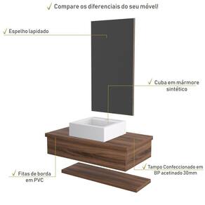 Sobre o ProdutoConjunto Bancada C/Cuba Q39, Prateleira e Espelheira Metrópole 806 Branco ChessDescrição do Produto:O Conjunto (Bancada + Cuba + Espelheira + Prateleira) Metrópole KTME806 é um produto compacto de design simples e moderno, projetado para pequenos espaços, perfeito para fazer parte da decoração do seu lavabo ou banheiro. Conta com uma cuba de apoio, uma espelheira e prateleira com pinos invisíveis, além do suporte linha Metrópole é uma coleção de móveis modernos e com inúmeras possibilidades de composições, combinando design contemporâneo e muita funcionalidade. Diversas possibilidades de cores e modelos de cubas formam uma solução perfeita para as mais opções de decoração e projetos em ambientes de banheiro. É você quem decide!!!Itens Inclusos:1 Conjunto Bancada C/Cuba, Prateleira e EspelheiraDimensões dos Produtos:Bancada: 80 x 43 x 19 cmEspelheira: 43 x 1,8 x 80 cmCuba 40 x 37,5 x 10 cmInformações Logísticas (Comp. X Prof. X Alt.) 83 x 47 x 26 cm - Peso: 24,71 KgPeso Total: 24,71 KgObservações:Não acompanha acessórios decorativos. Imagens meramente ilustrativas.Informações Técnicas / Características:- Cor do Produto: Branco Chess- Cor do Predominante: Branco- Marca: Compace- Modelo: KTME806- Linha: Metrópole- Material: Mdp - Acabamento: Perffect Acetinado- Escala de Brilho: Fosco- Fita de Borda: Pvc - Possui Gavetas: Não - Material do Puxador: Alumínio- Possui Prateleiras: 1- Peso Máximo por Prateleira: 02 kg- Possui Pés: Não, suspenso - Possui Espelho: Sim - Acompanha Cuba / Lavatório: Sim, de Mármore Sintético- Furação para Cuba / Lavatório: Não- Tipo da Cuba: Apoio- Cor da Cuba: Branca- Suporta Até (kg): 12 kg - Peso Lí.: 23,64Kg- Recomendações de Uso, Manutenção e Limpeza: Para a limpeza, utilize flanela seca ou pano macio levemente umedecido em água. Utilize um pano seco em seguida. Evite com produtos químicos (solventes, thinner, acetona, etc) e não utilize nenhum tipo de esponja de aço.- Necessita de Montagem: Sim / Acompanha Manual de Montagem- Complexidade da Montagem: Média: pode ser montado por mais de uma pessoa e/ou necessite de maior conhecimento para montagem.- Garantia: 6 meses- Outras Características: Montagem ível, o suporte toalheiro pode ser montado em qualquer um dos lados. Material: Mdp | Acabamento: Perffect Acetinado | Escala de Brilho: Fosco | Fita de Borda: Pvc | Tipo de Produto: Bancada para Banheiro | Comprimento: 80 | Largura: 42 | Limite de unidades por venda: É possível comprar até 1 unidade por venda. | Altura: 19 | Profundidade: 42 | Quantidade máxima de pedido: 1 | Preço tabelado: 429 | Cor: Multicolorido | Certificação de teste externa: Não Aplicável | Baterias são necessárias?: false | Palavras-chave de Pesquisa: Não aplicável | Fonte de energia: Não aplicável | Fabricante: Compace | Peso do item: | Componentes incluídos: | Is Fragile: | Exige montagem: | da peça: | Dimensões do item P x L x A: | Principais Características do Produto 0: | Principais Características do Produto 1: | Principais Características do Produto 2: | do modelo: | Quantidade de itens: | de caixas: Cor: Nogal