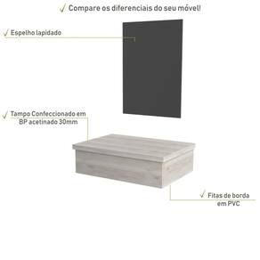 Sobre o ProdutoConjunto Bancada e Espelheira KTME602 Branco ChessDescrição do Produto:O Conjunto (Bancada + Espelheira) Metrópole KTME602 é um produto compacto de design simples e moderno, projetado para pequenos espaços, perfeito para fazer parte da decoração do seu lavabo ou banheiro. Conta com uma espelheira com espelho lapidado, além do suporte linha Metrópole é uma coleção de móveis modernos e com inúmeras possibilidades de composições, combinando design contemporâneo e muita funcionalidade. Diversas possibilidades de cores e modelos de cubas formam uma solução perfeita para as mais opções de decoração e projetos em ambientes de banheiro. É você quem decide!!!Itens Inclusos:1 Conjunto Bancada e EspelheiraDimensões dos Produtos:Bancada: 60 x 43 x 19 cmEspelheira: 43 x 1,8 x 60 cm: Informações Logísticas (Comp. X Prof. X Alt.) 63 x 47 x 26 cm - Peso: 12,24 KgPeso Total: 12,24 KgObservações:Não acompanha acessórios decorativos. Imagens meramente ilustrativas.Informações Técnicas / Características:- Cor do Produto: Branco Chess- Cor do Predominante: Branco- Marca: Compace- Modelo: KTME602- Linha: Metrópole- Material: Mdp - Acabamento: Perffect Acetinado- Escala de Brilho: Fosco- Fita de Borda: Pvc - Possui Gavetas: Não - Material do Puxador: Alumínio - Possui Pés: Não, suspenso - Possui Espelho: Sim - Acompanha Cuba / Lavatório: Não- Furação para Cuba / Lavatório: Não - Suporta Até (kg): 10 kg - Peso Lí.: 11,34Kg- Recomendações de Uso, Manutenção e Limpeza: Para a limpeza, utilize flanela seca ou pano macio levemente umedecido em água. Utilize um pano seco em seguida. Evite com produtos químicos (solventes, thinner, acetona, etc) e não utilize nenhum tipo de esponja de aço.- Necessita de Montagem: Sim / Acompanha Manual de Montagem- Complexidade da Montagem: Média: pode ser montado por mais de uma pessoa e/ou necessite de maior conhecimento para montagem.- Garantia: 6 meses- Outras Características: Montagem ível, o suporte toalheiro pode ser montado em qualquer um dos lados. Material: Mdp | Acabamento: Perffect Acetinado | Escala de Brilho: Fosco | Fita de Borda: Pvc | Comprimento: 60 | Largura: 42 | Altura: 19 | Profundidade: 42 | Limite de unidades por venda: É possível comprar até 1 unidade por venda. | Preço tabelado: | Quantidade máxima de pedido: 1 | | Palavras-chave de Pesquisa: | Principais Características do Produto 0: | Cor: | Baterias são necessárias?: | Certificação de teste externa: | Principais Características do Produto 1: | Componentes incluídos: | Principais Características do Produto 2: | Is Fragile: | Fabricante: | Peso do item: | Dimensões do item P x L x A: | Exige montagem: | da peça: | de caixas: | do modelo: | Quantidade de itens: Cor: Snow