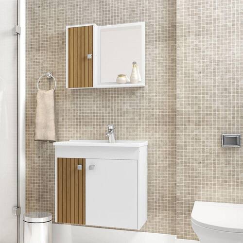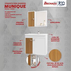 O Conjunto para Banheiro Munique composto por lavatório em mármore sintético, armário superior, espelheira e gabinete, elaborado em MDF com espessura de 12 mm. Pintura da superfície em verniz poliéster semi-brilho, com secagem UV e impressão a laser, com acabamento com textura em alto relevo, destacando os veios da madeira com cores mais próximas às naturais. Acabamento nas bordas com fita de papel decorativo aplicado mecanicamente por sistema hot melting. Puxadores de plástico com acabamento cromado, dobradiças metálicas. Ele é tudo o que falta para o seu banheiro ficar completo!