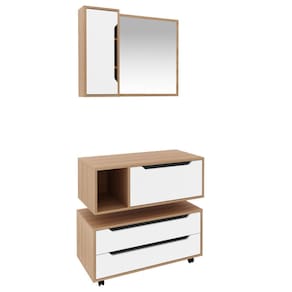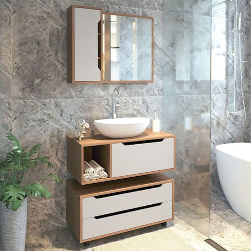 O Conjunto Banheiro com Gabinete Suspenso 1 Gaveta Espelheira Armário com Rodízio Tecno Mobili, possui 1 porta com frente usinada, tampo e nicho lateral. Estrutura em MDP e acabamento em pintura UV e partes em BP. O produto não acompanha cuba. Possui 1 porta com frente usinada, espelho de 560x505x3mm e 3 prateleiras internas. Estrutura em MDP e acabamento em pintura UV e partes em BP. Montagem reversível, podendo ser montado para ambos os lados. Possui 2 gavetas com frente usinada, tampo e rodízio que permite movimento. Estrutura em MDP e acabamento em pintura UV e partes em BP. Imagem meramente ilustrativa. A decoração do ambiente não acompanha o produto. O produto será entregue desmontado.
