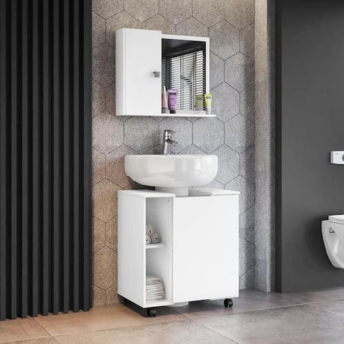 Já o Gabinete Pequim foi projetado especialmente para lavatórios de coluna, encaixando-se perfeitamente abaixo da cuba, entre a coluna. Fabricado em MDP de 12 mm, apresenta acabamento em verniz poliéster brilhante com secagem UV, impressão a laser e bordas protegidas com fita decorativa no sistema hot melting. Dispõe de 1 porta com dobradiças metálicas, 6 nichos internos que facilitam a organização e 4 rodízios, que permitem fácil movimentação sempre que necessário.