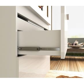 Frente das gavetas com revestimento em BP com efeito alto brilho.