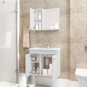 Espelheira com espelho incluso, compartimentos internos e portas com dobradiças metálicas
