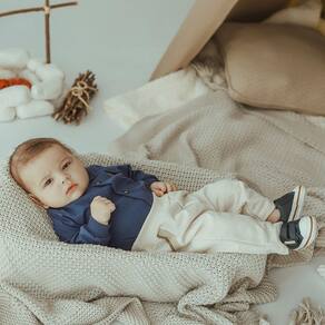 Por que escolher este conjunto? -Conforto Superior: O alto teor de algodão em ambas as peças garante respirabilidade e o máximo de conforto para a pele sensível do bebê. - Design Encantador: A combinação das cores azul marinho e natural estilosocado cria um visual super fofo e charmoso. - Praticidadee no Dia a Dia: Peças fáceis de vestir e ideais para diversas ocasiões, desde o dia a dia até um passeio no parque.