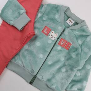 O conjunto de bebê menina Elian é perfeito para manter sua pequena quentinha e estilosa nos dias mais frios. A jaqueta em pelo, com zíper frontal, letras bordadas LOVE e um fofo detalhe de gatinha, adiciona charme e delicadeza ao look. Além disso, possui punho nas mangas e na cintura, garantindo um ajuste confortável e aconchegante.
