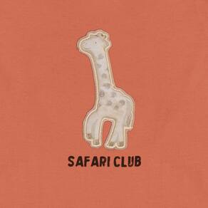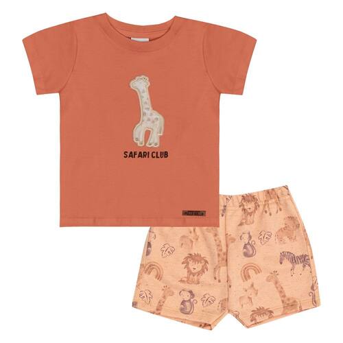 Conjunto baby girafa! Invista para seu baby conforto e qualidade que ele merece para brincar e movimentar-se com segurança e fofura, o conjunto possuí a camiseta em meia malha na cor ferrugem com estampa de girafa em aplique termocolante e escrita Safari Club e a bermuda em moletom linho sublimado pêssego com estampa de animais e elastano na cintura para melhor movimento e segurança do bebê.