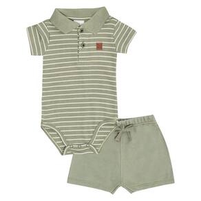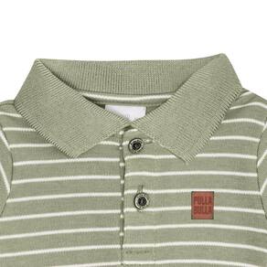 Conjunto baby charmoso e perfeito para acompanhar o dia a dia dos pequenos. Com o body confeccionado em suedine fio tinto listrado na cor chá verde, possuí gola polo e aplique termocolante frontal com identificação pulla bulla e botões de abertura na gola e entre as pernas. Já a bermuda piqueton na cor chá verde possuí elastano na cintura para faciliar a segurança e a movimentação do baby.
