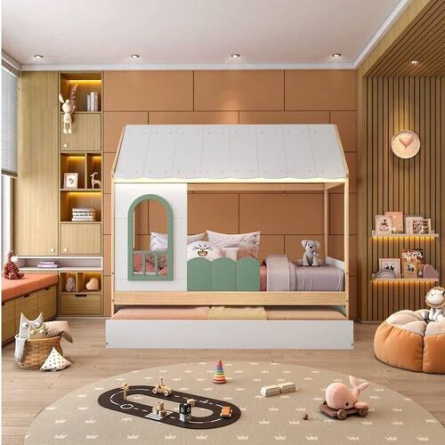 O Conjunto Bicama Reversível New Garden da Casatema é a escolha ideal para quem busca conforto, diversão e funcionalidade para o quarto infantil. Seu design inovador com telhado, janela e grade frontal cria um ambiente lúdico e seguro, estimulando a imaginação das crianças. Com iluminação LED embutida no telhado, a cama proporciona uma atmosfera acolhedora e tranquila, perfeita para momentos de descanso. A bicama também oferece versatilidade, permitindo que o segundo colchão seja facilmente guardado, otimizando o espaço do quarto.