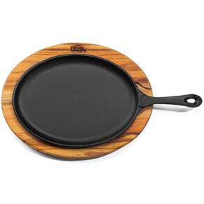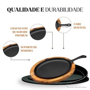 O Conjunto Chapa Oval Cabo de Ferro da Panela Mineira é um produto moderno, prático e eficiente, que apresenta alto desempenho no preparo de diversas receitas. Ideal para preparar, fritar, selar e grelhar carnes. Acompanha suporte de madeira para dar mais charme a sua peça. Sua excelente distribuição e retenção de calor, característico do ferro fundido, mantém os alimentos aquecidos por muito mais tempo, além de enaltecer seus sabores e aromas. Pode ser utilizada diretamente sobre todas as fontes de calor, assim como churrasqueiras. Muito utilizada por bares e restaurantes para servir porções devido a sua resistência, boa apresentação e por manter-se quente por mais tempo.