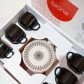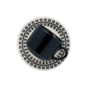 Conjunto Biona 12 Peças Xícaras + Pires Donna Folk 180ml A cor preta é básica e neutra, um verdadeiro curinga na hora de montar a mesa. Nessa louça, colocamos a cor preta numa estampa mais alegre e jovial, perfeita para quem prefere um formato de pratos tradicional com uma decoração mais alegre. A xícara preta, sem decoração, cria uma linda composição com os pires.