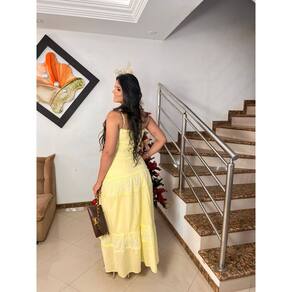 O conjunto feminino é composto por um cropped e uma saia longa. O cropped possui alças finas e detalhes em bordado. A saia longa, com comprimento até os tornozelos, apresenta recortes e babados com o mesmo detalhe em bordado, sugerindo um tecido leve como algodão, viscose ou alfaiataria, ideal para climas quentes ou ocasiões casuais e festivas. Marca: Não Informado