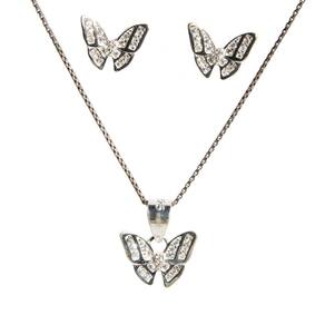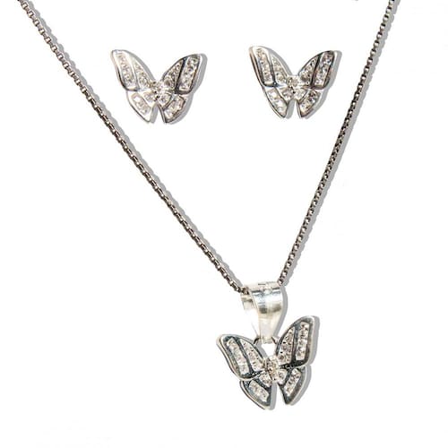 Nome da Joia: Conjunto Borboleta Butterfly Material: Prata 925 Pedra: Zircônia (Brilhante e Densa) Tamanho das Zircônias: 7mm Peso Total das Pedras: 8,5ct (sem corrente) Design: Borboleta, delicado e elegante Cor das Pedras: Brilho cristalino, com excelente dispersão de luz