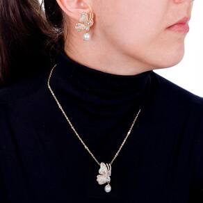 O Conjunto é composto por um colar e um par de brincos banhados a ouro com aplicação de pérolas e zircônias cristais. É delicado e luxuoso que te deixa em destaque em qualquer situação.