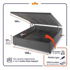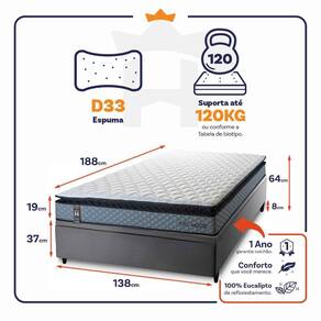 - Altura: 19 cm (colchão) + 37 cm (box baú) + 8 cm (pés) = 64 cm de altura;