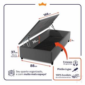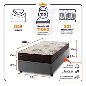 - Altura: 20 cm (colchão) + 37 cm (box baú) + 8 cm (pés) = 65 cm de altura;