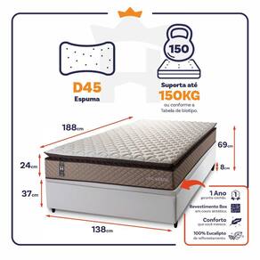- Altura: 24 cm (colchão) + 37 cm (box baú) + 8 cm (pés) = 69 cm de altura;