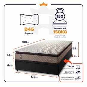 - Altura: 24 cm (colchão) + 37 cm (box baú) + 8 cm (pés) = 69 cm de altura;