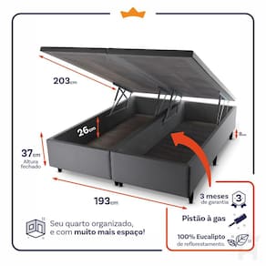 - Altura: 24 cm (colchão) + 37 cm (box baú) + 8 cm (pés) = 69 cm de altura;
