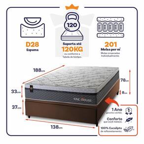 O Colchão Bento é feito com os mais nobres materiais em sua composição, ele conta com espuma D28 e molas ensacadas. Por ser mais macio, o colchão de molas ensacadas individualmente traz benefícios e ajuda no alinhamento da coluna. O colchão King House acomoda melhor o contorno do corpo, dispondo de forma correta quadris e ombros, expulsando as dores e problemas de coluna.