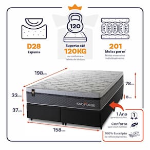 O Colchão Bento é feito com os mais nobres materiais em sua composição, ele conta com espuma D28 e molas ensacadas. Por ser mais macio, o colchão de molas ensacadas individualmente traz benefícios e ajuda no alinhamento da coluna. O colchão King House acomoda melhor o contorno do corpo, dispondo de forma correta quadris e ombros, expulsando as dores e problemas de coluna.