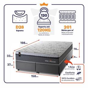 O Colchão Bento é feito com os mais nobres materiais em sua composição, ele conta com espuma D28 e molas ensacadas. Por ser mais macio, o colchão de molas ensacadas individualmente traz benefícios e ajuda no alinhamento da coluna. O colchão King House acomoda melhor o contorno do corpo, dispondo de forma correta quadris e ombros, expulsando as dores e problemas de coluna.