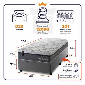 O Colchão Bento é feito com os mais nobres materiais em sua composição, ele conta com espuma D28 e molas ensacadas. Por ser mais macio, o colchão de molas ensacadas individualmente traz benefícios e ajuda no alinhamento da coluna. O colchão King House acomoda melhor o contorno do corpo, dispondo de forma correta quadris e ombros, expulsando as dores e problemas de coluna.
