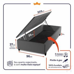 - Altura: 33 cm (colchão) + 37 cm (box baú) + 8 cm (pés) = 78 cm de altura;