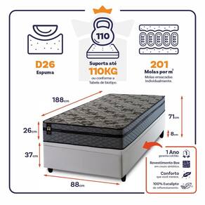 Medidas do Colchão: 88x188x26 cm, 96X203x26 cm, 138x188x26 cm, 158x198x26 cm.