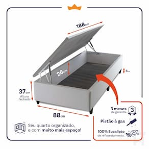 - Altura: 26 cm (colchão) + 37 cm (box baú) + 8 cm (pés) = 71 cm de altura;