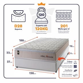 O Colchão Roma é feito com os mais nobres materiais em sua composição, ele conta com espuma D28 e molas ensacadas. Por ser mais macio, o colchão de molas ensacadas individualmente traz benefícios e ajuda no alinhamento da coluna. O colchão King House acomoda melhor o contorno do corpo, dispondo de forma correta quadris e ombros, expulsando as dores e problemas de coluna.