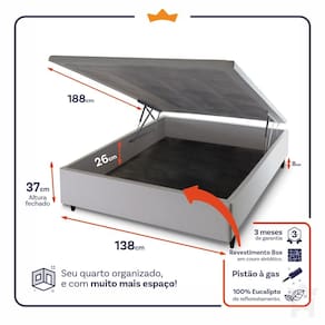 - Altura: 33 cm (colchão) + 37 cm (box baú) + 8 cm (pés) = 78 cm de altura;